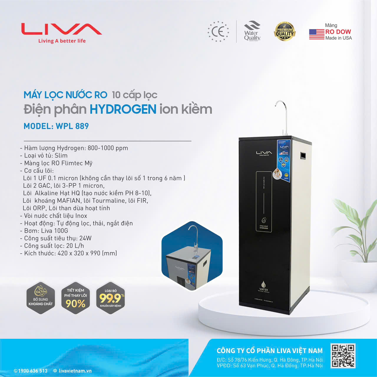 ► Máy lọc nước Liva Hydrogen WPL 889 có thiết kế tủ đứng, một vòi và một van xoay lấy nước dễ dàng. Máy có công suất lọc 20 lít/giờ với dung tích bình chứa 7 lít phù hợp cho gia đình 4- 6 người.